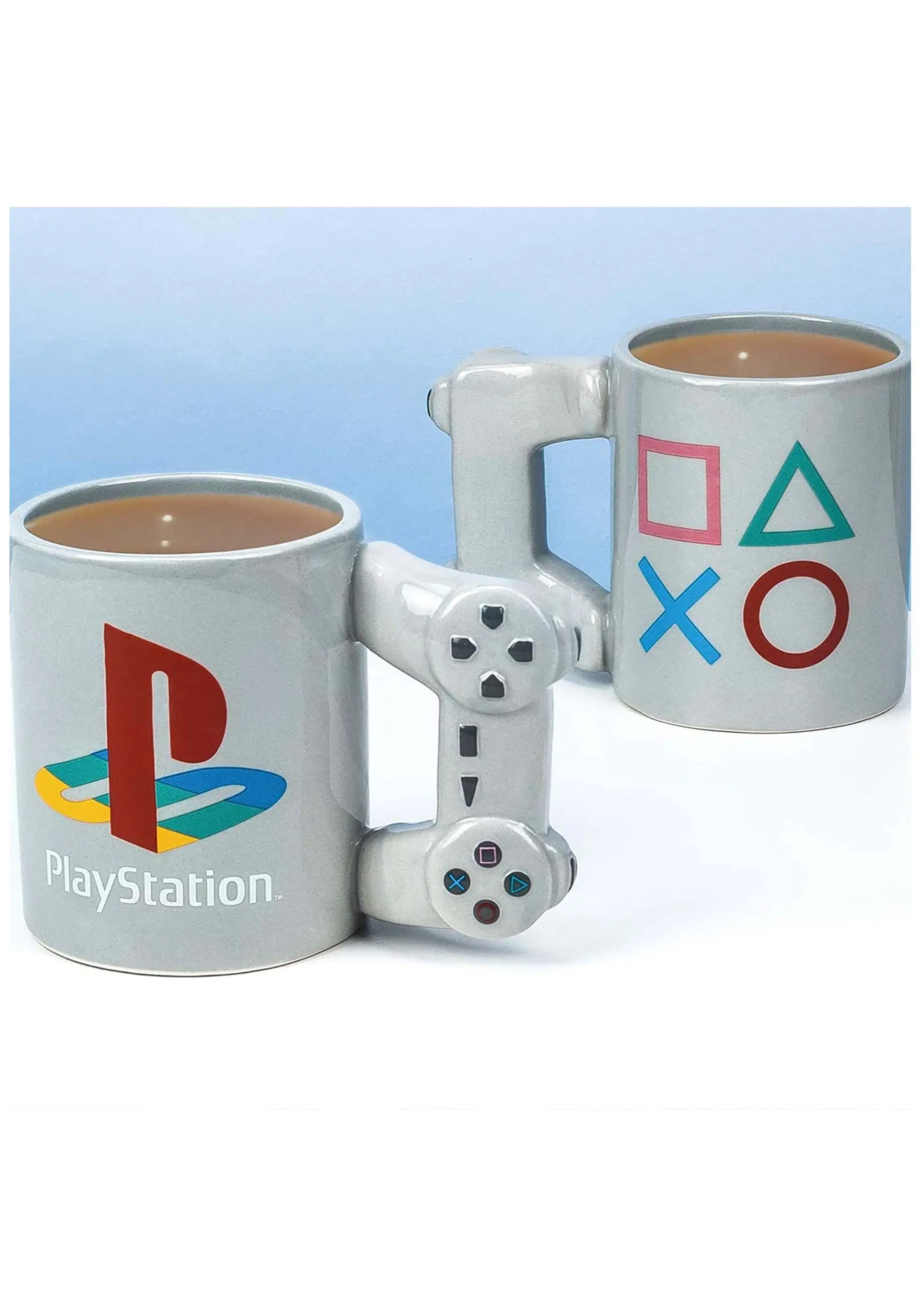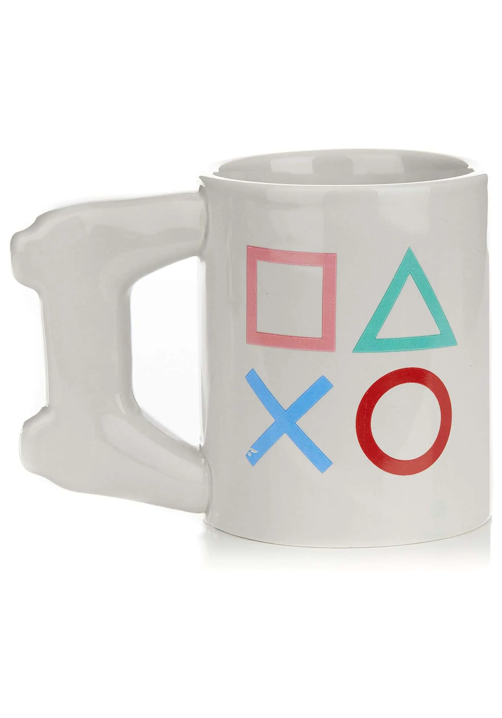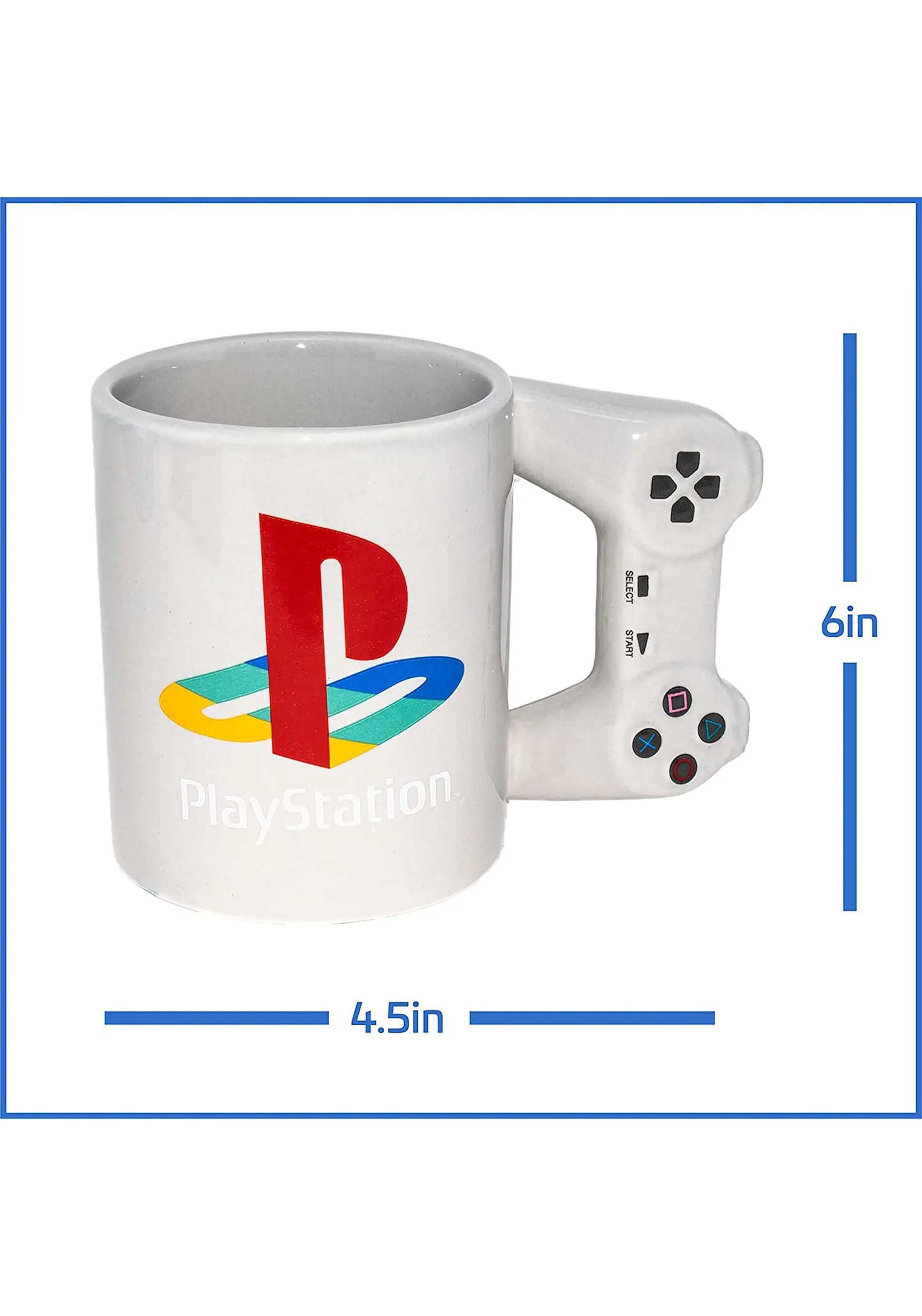 Stay fueled up with this officially licensed Playstation Controller Mug. You won’t find another one like it anywhere! The main cup, printed with the official PlayStation logo in yellow, green, blue, and red, holds 10 ounces of hot or cold liquids. The controller-shaped handle keeps your hand safe from spills, and it’s sturdier than your average flimsy mug handle. It’s ceramic so holds in heat and cool, but it’s not dishwasher or microwave safe, so plan accordingly. Any PlayStation fans, whether retro or current, will love this visually interesting and original drinking vessel. In an appealing light gray/off-white color, it will go with all your decor.