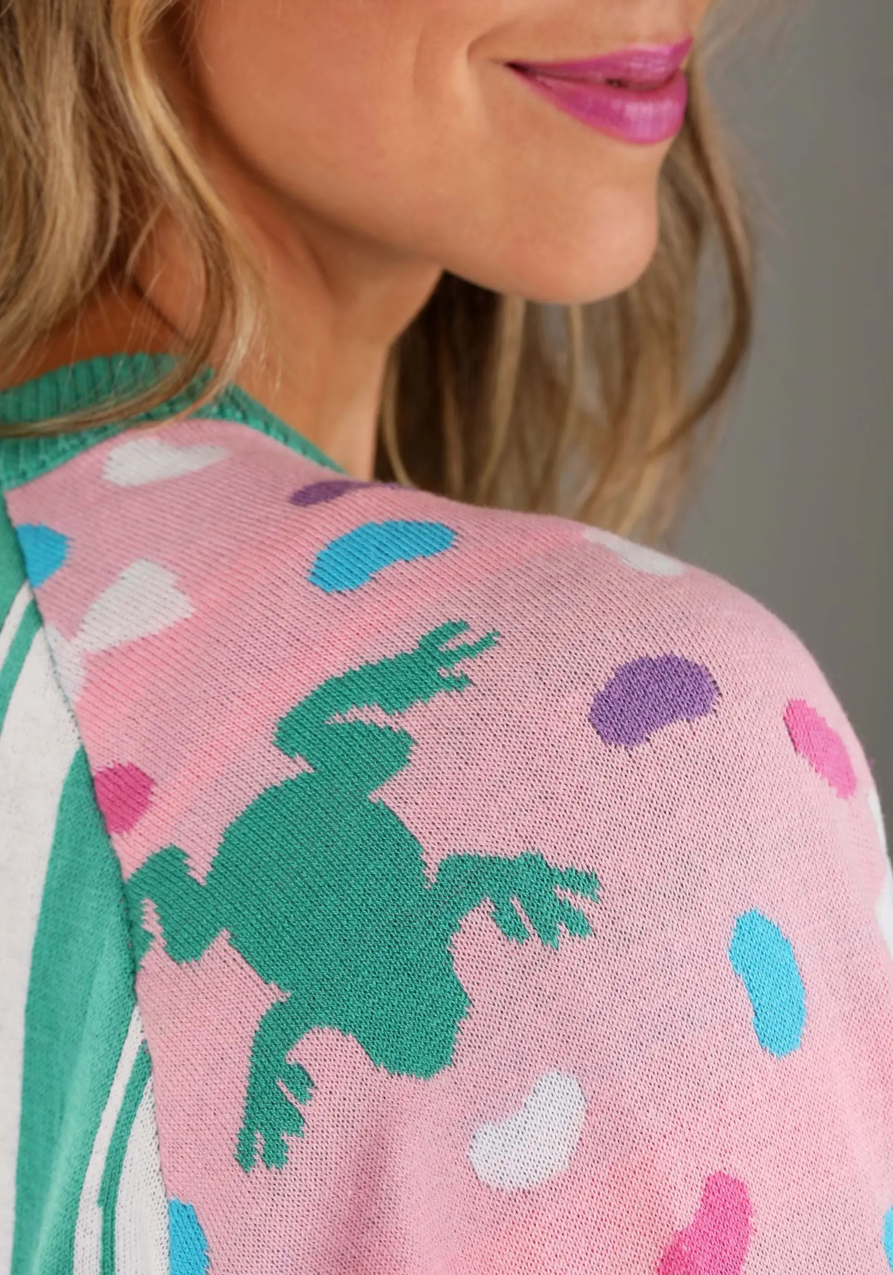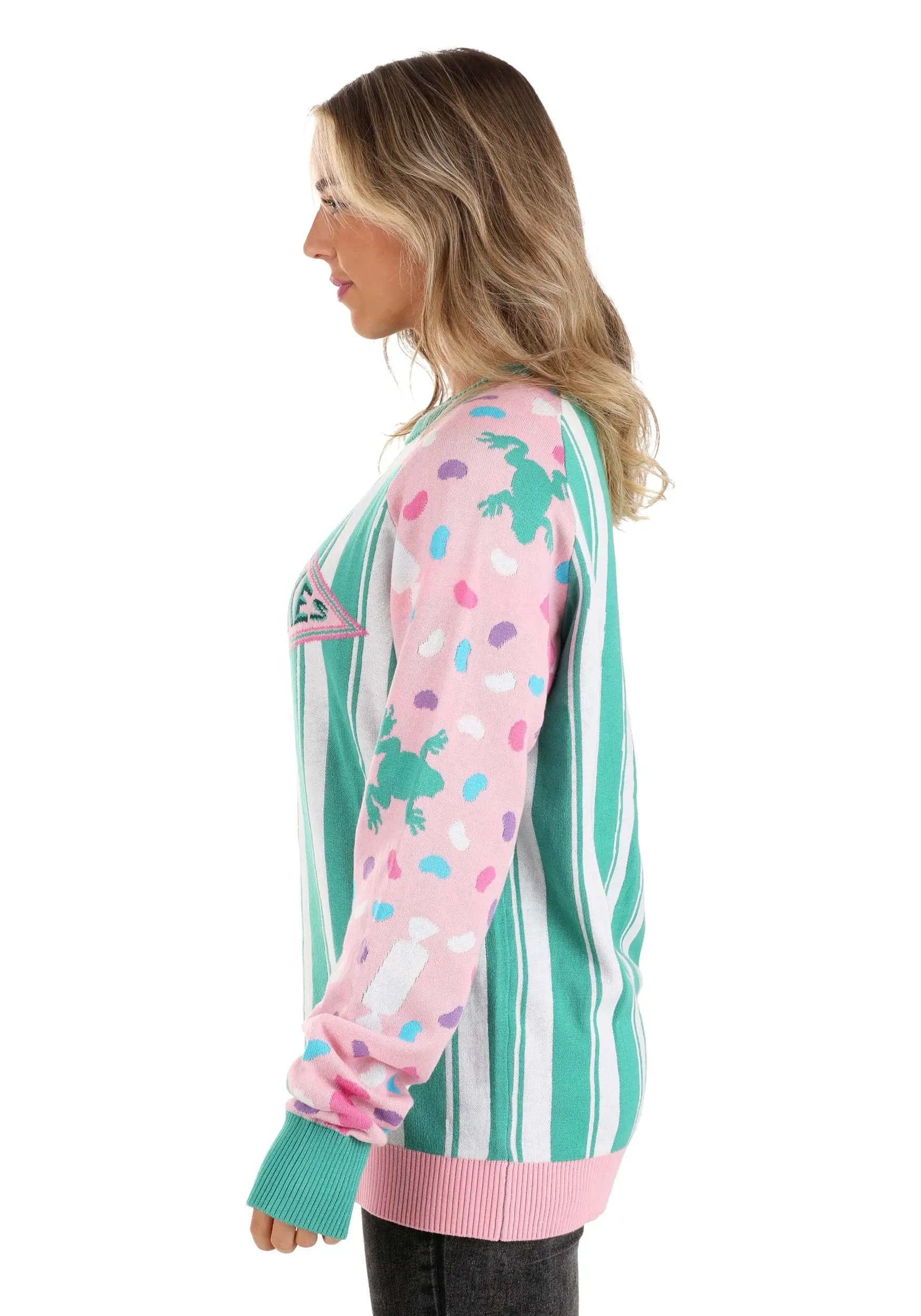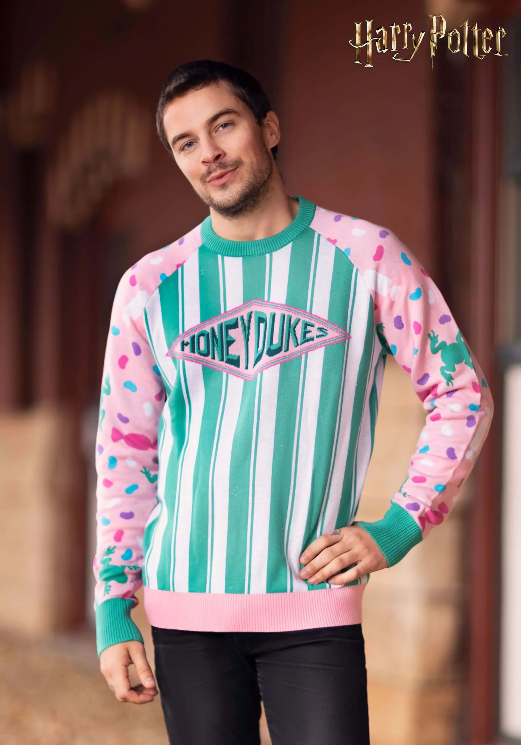 Our designers imagined a sweater that’s perfect to wear on your next Hogsmeade trip! This Honeydukes Candy Sweater for Adults is inspired by the legendary candy shop from the world of Harry Potter. The pink sleeves feature an all-over print that includes jelly beans, frogs, and wrapped candy. The rest of the sweater is designed with green and white stripes, with the Honeydukes logo on the front. This sweet sweater is perfect for any Harry Potter fan!
