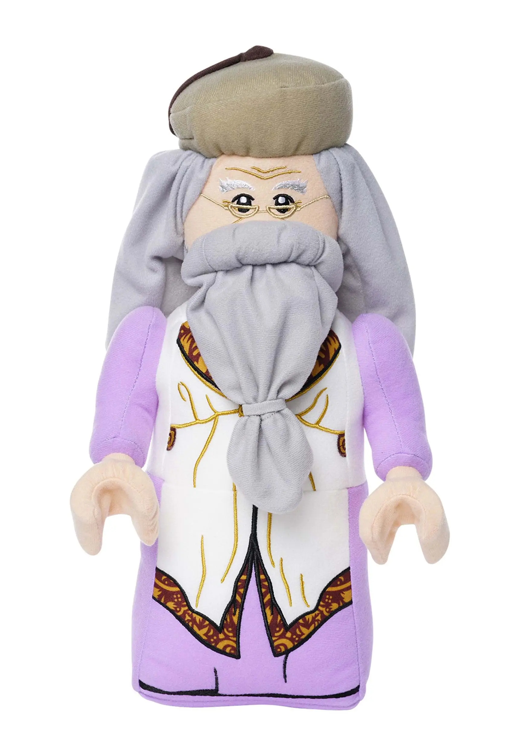 Celebrate one of your favorite Harry Potter characters with this officially licensed Kid’s Harry Potter LEGO Albus Dumbledore Plush! The stuffed figure is printed with fun graphics including Dumbledore’s half-moon spectacles and ornate robes, and features a beard made of gray cloth.